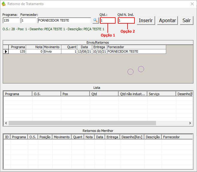 Exemplo: você enviou 5 peças, seu fornecedor devolveu as 5 porem 2 nao foram industrializadas, logo você retorna as 5 na opção 1, e na opção 2 informa as 2 peças que nao foram feitas, isso lhe permitira fazer o apontamento novamente de 2 peças depois para nova remessa de envio para industrialização. - Clique em Inserir e depois Apontar