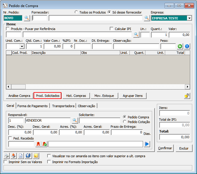 Com os itens Requisitados acima, ao abrir o Pedido de Compras no Menthor (Cadastro > Pedido de Compra) e clicado no Botão destacado na imagem abaixo, você poderá ver todos os itens solicitados e suas quantidades, você poderá tambem marcar e importar um ou mais itens para o pedido, inclusive alterar as quantidades para efetuar o pedido de compras.